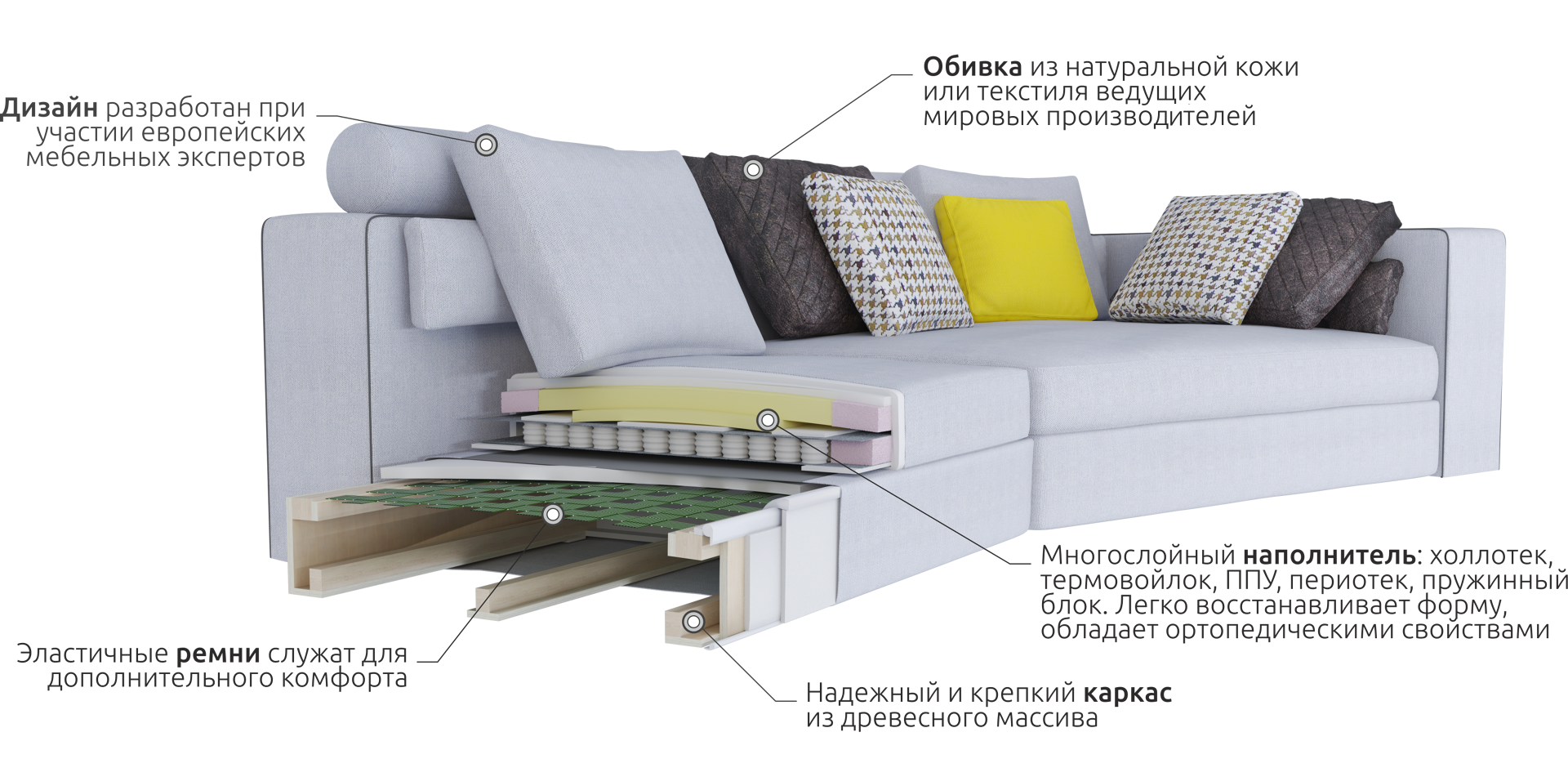 Вся мебель производится на европейском оборудовании. Мастера два раза в год проходят курсы повышения квалификации. Для обивки используются материалы из Италии, Бельгии, Турции и Китая. Уникальная технология производства каркаса. Тройной контроль отгружаемой продукции.